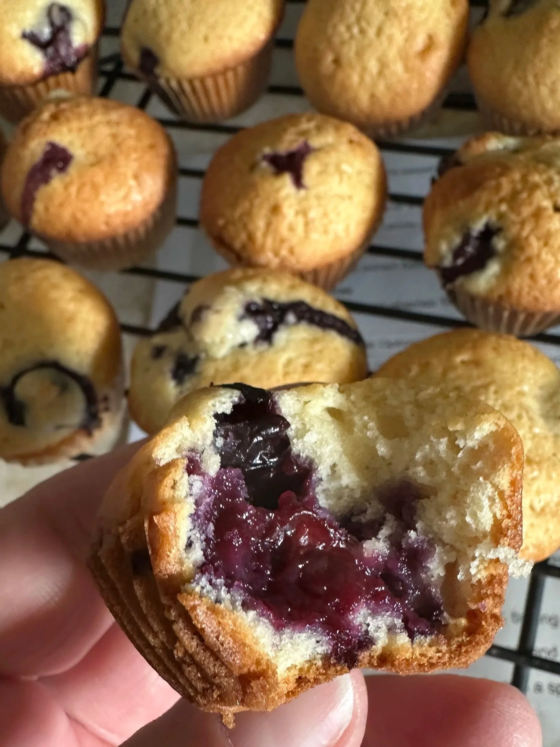 NOTES: I couldn’t find my 12 muffin tin. I used a 24 mini muffin tin instead. You could add other berries or chips to this basic muffin recipe to change the flavors up. It’s simple and easy to make by hand just a couple bowls, whisk, spatula and a little arm power needed. Great to do with little kids for learning kitchen skills.